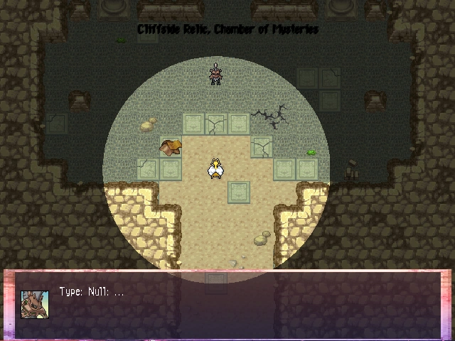 When entering the Chamber of Mysteries, the player will be greeted by Type: Null. It asks you to follow it, acknowledging the player's want to evolve. It tells the player its past trouble with evolving, trying to persuade the player into reconsidering evolving. Inevitably it wants to see if the player is ready to undertake evolution, and wishes to engage into a fight with the player. If the player defeats Type: Null, it will drop an