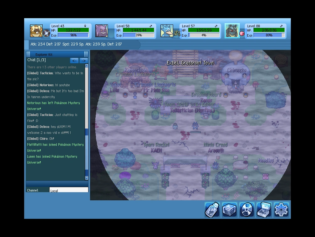 The first page is the chat. When the player logs in to the game, the chat will display a welcome message, the current in-game time and day of the week, as well as the amount of players online at the time of logging on. The player can type in the chat clicking the bar just below it. The channel that messages will be sent can be changed below the message box. The arrow in the top right of the Explorer Kit window will go to the other pages.