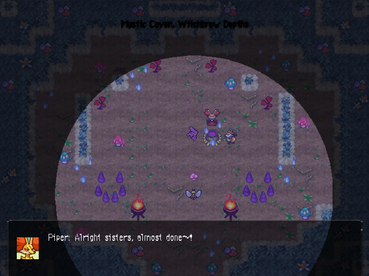 Upon arriving to the end of the dungeon, the player will stumble upon three witches; Mismagius, Braixen and Delphox, who are named Phoebe, Paige and Piper respectively, attending to their cauldron and adding a couple of ingredients before noticing the player. They will then question if the player intends to interrupt them, and the players will be provided a chance of answering either "Yes" or "No". Regardless of the player's response, the witches will proceed to attack the player.