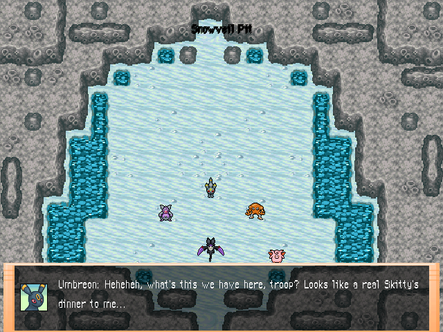 The boss is the rogue gang that the mother Beartic from Snowveil Den had mentioned to the player. The gang consists of an Umbreon, Hitmonlee, Grumpig, and Clefable fought simultaneously. The gang's members converse with each other (while this is going on, Umbreon gets annoyed by Hitmonlee, Grumpig and Hitmonlee argue with one another, Hitmonlee mentioning that the player will be easy to defeat, and then Clefable telling Umbreon that they should crush the player) and attacks. Afterwards, Umbreon finally gets so fed up with Hitmonlee that it vows revenge and leaves with its team.